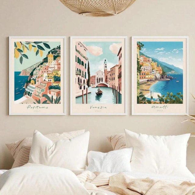 Bring the stunning beauty of Italy’s coast into your home with this captivating canvas wall art collection. Featuring the enchanting landscapes of Positano, Amalfi, and Venice, this set of vibrant travel posters transports you to the sun-kissed shores and historic streets of Italy. Whether you’re dreaming of a Mediterranean getaway or simply want to infuse your space with elegance and charm, these prints are the perfect addition.