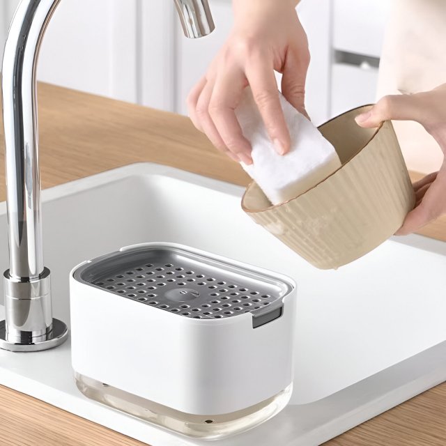 This soap dispenser is designed for one-handed use — simply press down on the pump to release just the right amount of soap directly onto your sponge. The built-in tray doubles as a sponge holder, helping you save valuable sink space while keeping everything within easy reach. Its leak-proof base prevents mess and makes cleanup quick and simple.